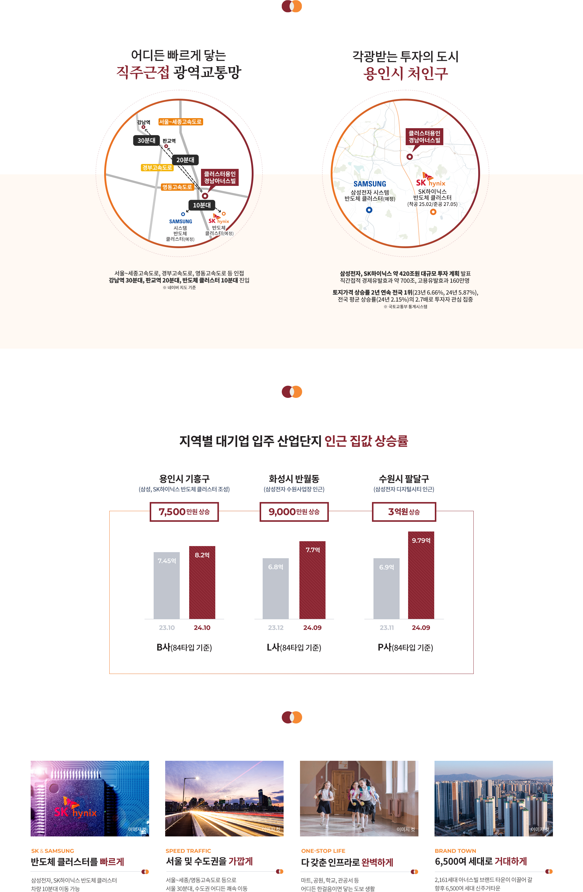 서울세종고속도로, 영동고속도로 접근성이 뛰어나고, 계획 중인 동용인IC가 개통되면 제2경부고속도로 이용 편의가 커질 전망입니다. 중부대로를 통한 처인구 중심 생활권 접근도 간편합니다. 남측 양지면 상업지구의 마켓·학원가·병원·공원은 이미 갖춰져 있어 입주 초기 생활 공백이 적을 것으로 보입니다. 교육은 양지초·용동중을 비롯해 추가 학교 2곳이 예정돼 도보 통학 여건이 좋습니다. 직장 접근성은 국제물류센터, SK하이닉스(약 8km), 그리고 인근 삼성전자 등 반도체 산단과의 근접성이 핵심 포인트로, 10분대 출퇴근 수요를 흡수할 가능성이 큽니다. 결국 클러스터용인 경남아너스빌의 핵심은 ‘가까움’입니다.