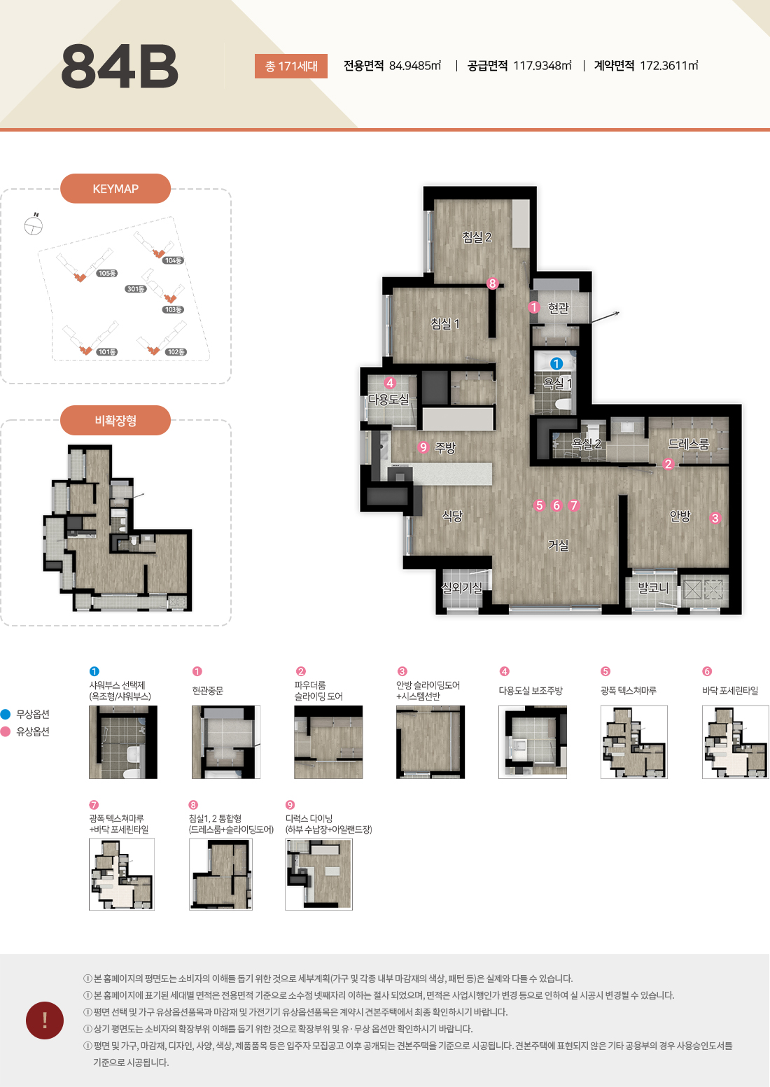 주력형 84A는 4베이 판상형과 맞통풍 동선이 장점입니다. 거실-주방 일직선 동선으로 생활 효율을 높이고, 알파룸·팬트리·현관창고·드레스룸을 곳곳에 배치해 수납 스트레스를 줄였습니다. 84B는 타워형 배치로 실·공간 분리가 확실해 사생활 보호에 유리합니다. 102㎡는 가족 수가 많은 집에 맞춘 대형 수납과 여유 있는 침실 폭이 강점입니다. 힐스테이트 서대구역 센트럴의 전 타입에 강화유리 난간, 와이드 창호를 적용해 개방감과 조망을 극대화한 점도 눈에 띕니다.