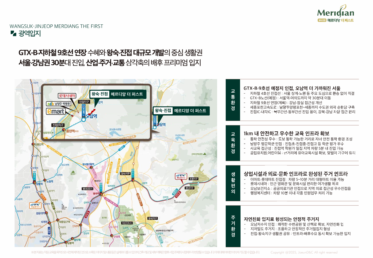 진접·오남축의 간선도로(경복대로, 진건오남로) 접근이 쉽고, 단지 인근 버스 노선으로 별내·도봉·노원 방향 환승이 수월합니다. 왕숙신도시 광역교통망이 순차 확충되면 서울 핵심 업무지까지의 이동 시간이 점진적으로 단축될 전망입니다. 이 흐름이 실거주 수요를 꾸준히 유입시키며, 왕숙 진접 메르디앙 더퍼스트의 환금성 방어력으로 연결됩니다.