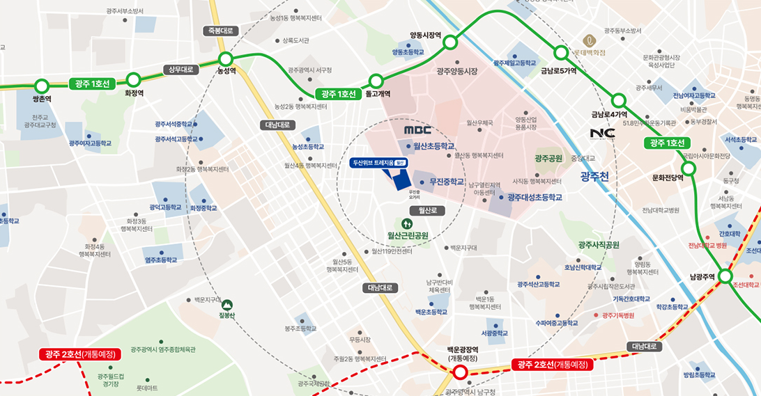 대남대로·독립로·월산로 등 주간선로 연결성이 좋아 광주 전역 이동이 빠르고, 광주종합터미널이 차량 10분 거리에 위치합니다. 특히 1호선 돌고개역까지 약 700m로 도보 접근이 가능한 역세권에 해당해 자차 비의존 통근도 현실적입니다. 두산위브 트레지움 월산의 직주근접성은 꾸준한 수요를 뒷받침합니다.