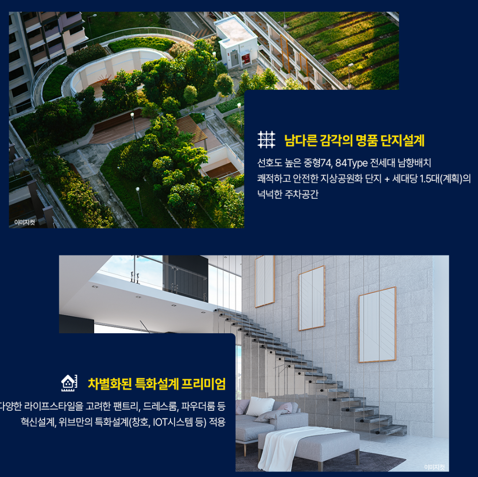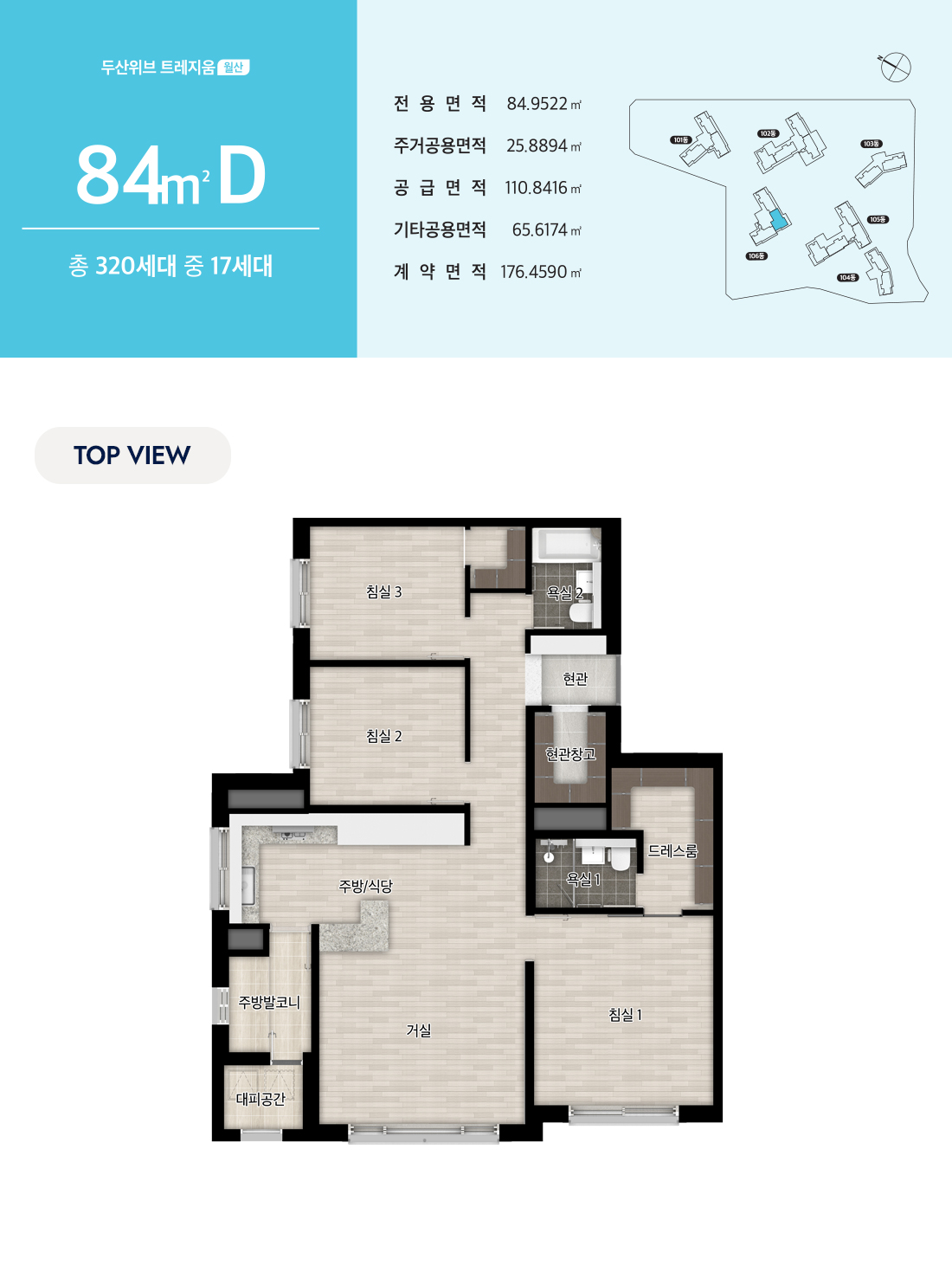 대지는 약 5,086평, 연면적 17,381평 규모로 용적률 212.03%의 여유로운 스펙입니다. 지하 3층~지상 20층, 총 6개 동 320세대이며 이 중 일반분양 71세대가 공급됩니다. 주차는 480대(세대당 약 1.52대)로, 퇴근 시간대 혼잡을 줄일 수 있는 수준입니다. 모든 주동은 남향 위주 배치로 계획돼 일조·채광을 확보했고, 동간 시선이 교차하지 않도록 배려한 점이 두산위브 트레지움 월산의 차별점입니다.