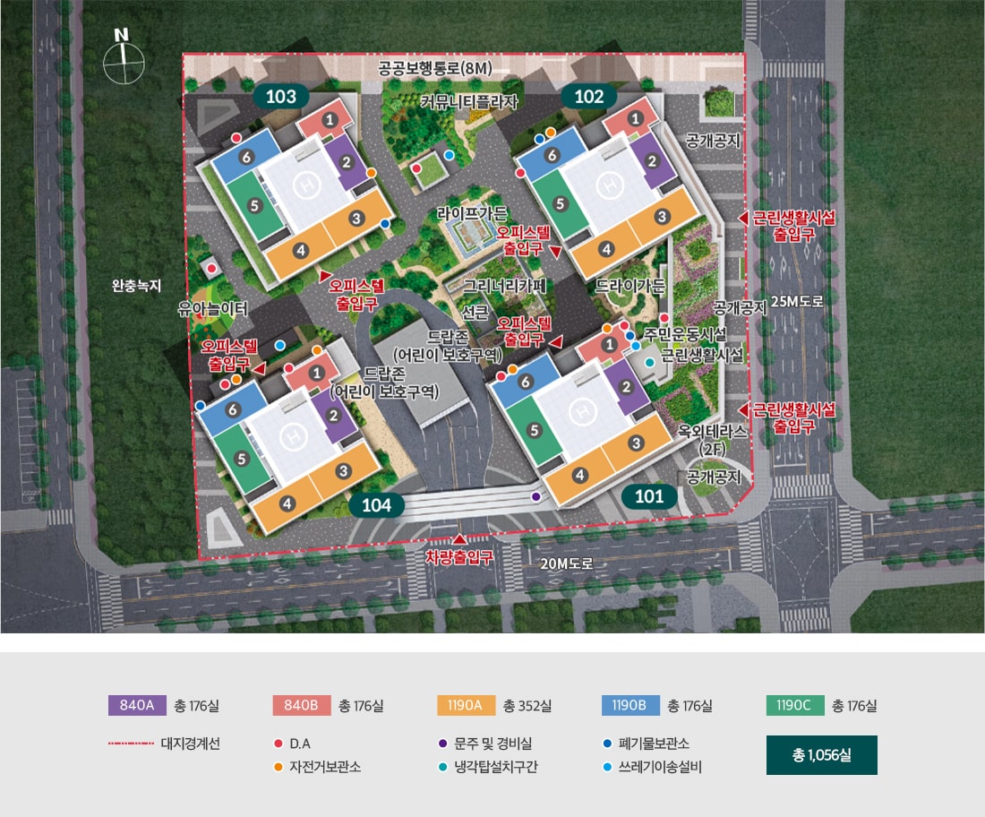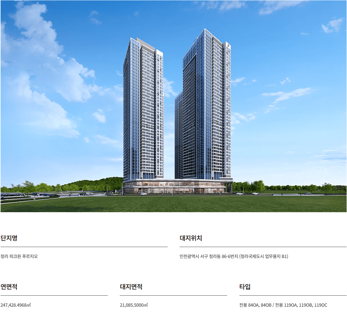 청라 피크원 푸르지오는 인천 서구 청라동 국제업무지구 B1BL, 대지 약 6,400평 위에 지상 49층, 4개 동, 총 1,056실 규모로 계획됐습니다. 용적률 약 800%, 건폐율 약 36%의 하이라이즈로, 커튼월과 수직 라인 설계가 어우러진 외관이 도심 스카이라인을 새로 그립니다. 지하 5층 전면 주차로 1,690면을 확보했고 전용 차량 동선과 드랍존을 도입해 피크타임 혼잡을 최소화했습니다. 청라 피크원 푸르지오는 고밀·고효율 설계의 전형을 보여주는 프로젝트라 할 수 있습니다.