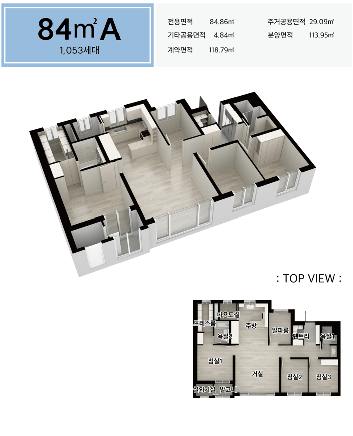 평면 구성은 84㎡ 단일이지만 성향이 다릅니다. 84A는 4Bay 판상형으로 맞통풍과 채광 효율, ㄱ·ㄷ자형 주방 동선의 안정감이 장점입니다. 84B는 타워형 베리에이션으로 거실 개방감과 프라이버시가 돋보이고, 드레스룸·붙박이장·복도 팬트리 같은 수납 옵션을 폭넓게 제안합니다. 실사용에서 체감되는 ‘가사 동선의 짧음’과 ‘수납 일원화’가 가장 큰 차별점으로, 견본주택·분양 자료에 근거한 요약입니다.