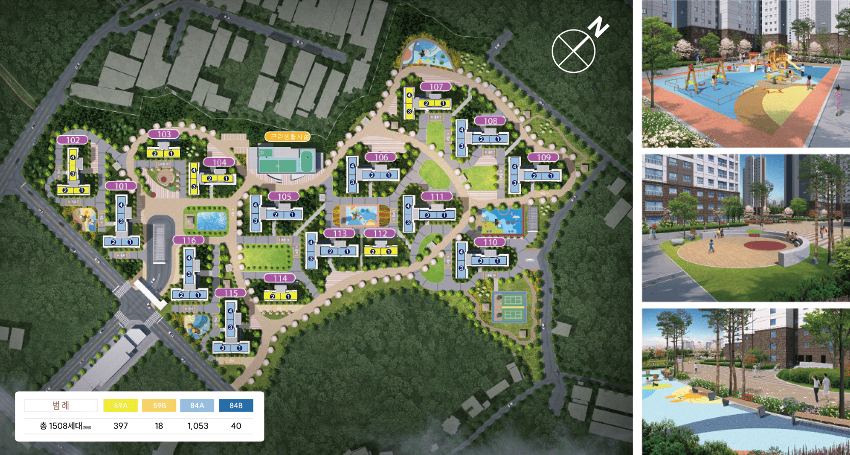 단지 외부 공간은 낮은 건폐율을 살려 녹지와 보행 동선을 전면에 둡니다. 중앙 광장과 외곽 소공원을 연계하고, 금산천 인접성을 살려 수공간 경관을 끌어들이는 배치가 특징입니다. 내부 커뮤니티는 피트니스·골프연습장·GX룸, 도서관·독서실·비즈니스룸, 어린이집·맘스 스테이션·실내외 놀이터, 경로당까지 전 세대 라이프사이클을 커버하도록 구성됩니다. 입면이나 커뮤니티 세부는 사업지 소개와 지역 매체·블로그에 다수 정리돼 있습니다.