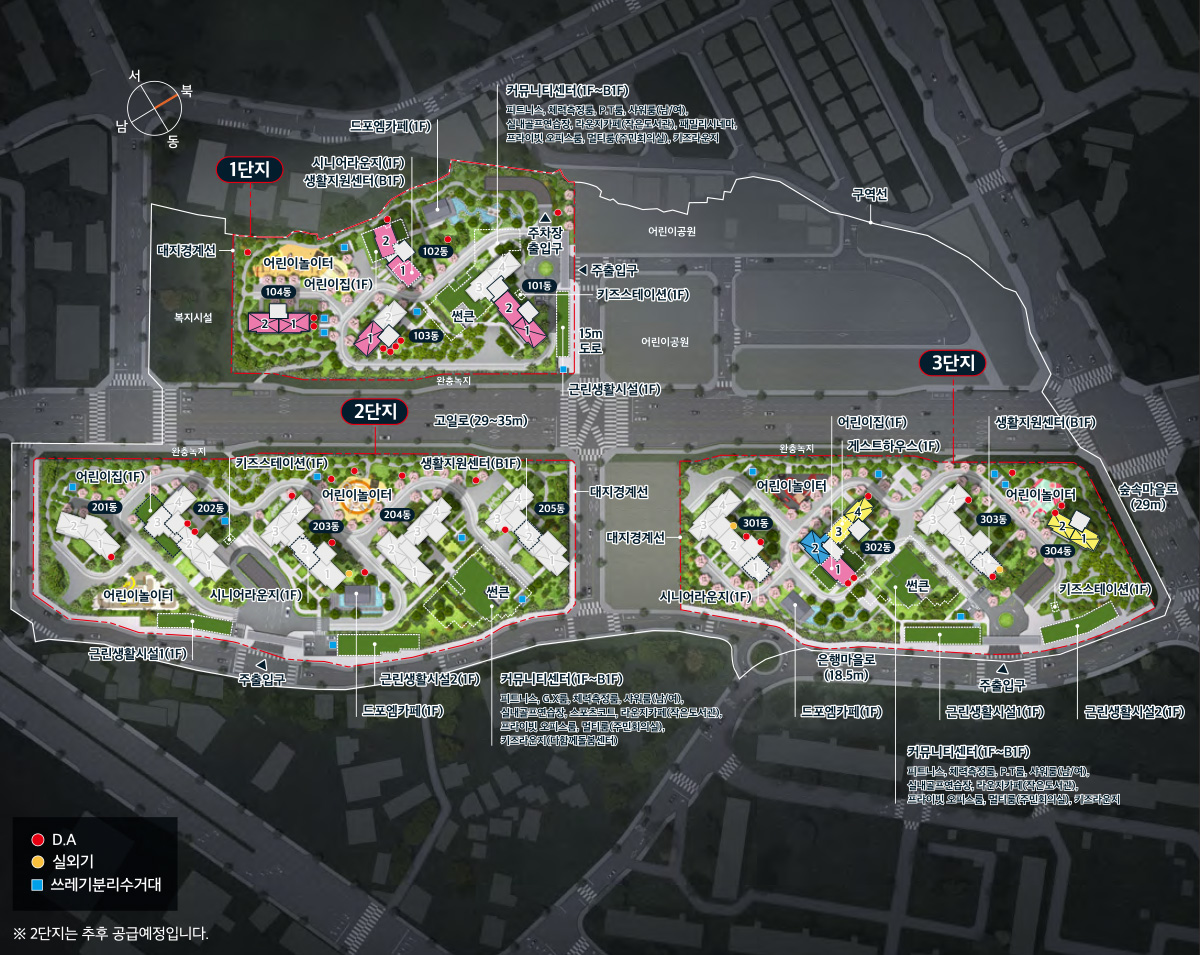 단지는 3개 블록으로 나뉘며 남향 위주의 T자형 동 배치가 특징입니다. 동간 거리를 넉넉히 확보해 사생활 보호에 유리하고, 지상에는 산책로와 썬큰, 어린이놀이터, 키즈 스테이션 등 생활밀착형 공간이 촘촘하게 이어집니다. 차량 동선이 분리되어 아이들과 어르신이 걷기 좋은 환경이 조성된 점은 실거주 만족도를 높이는 요소입니다.