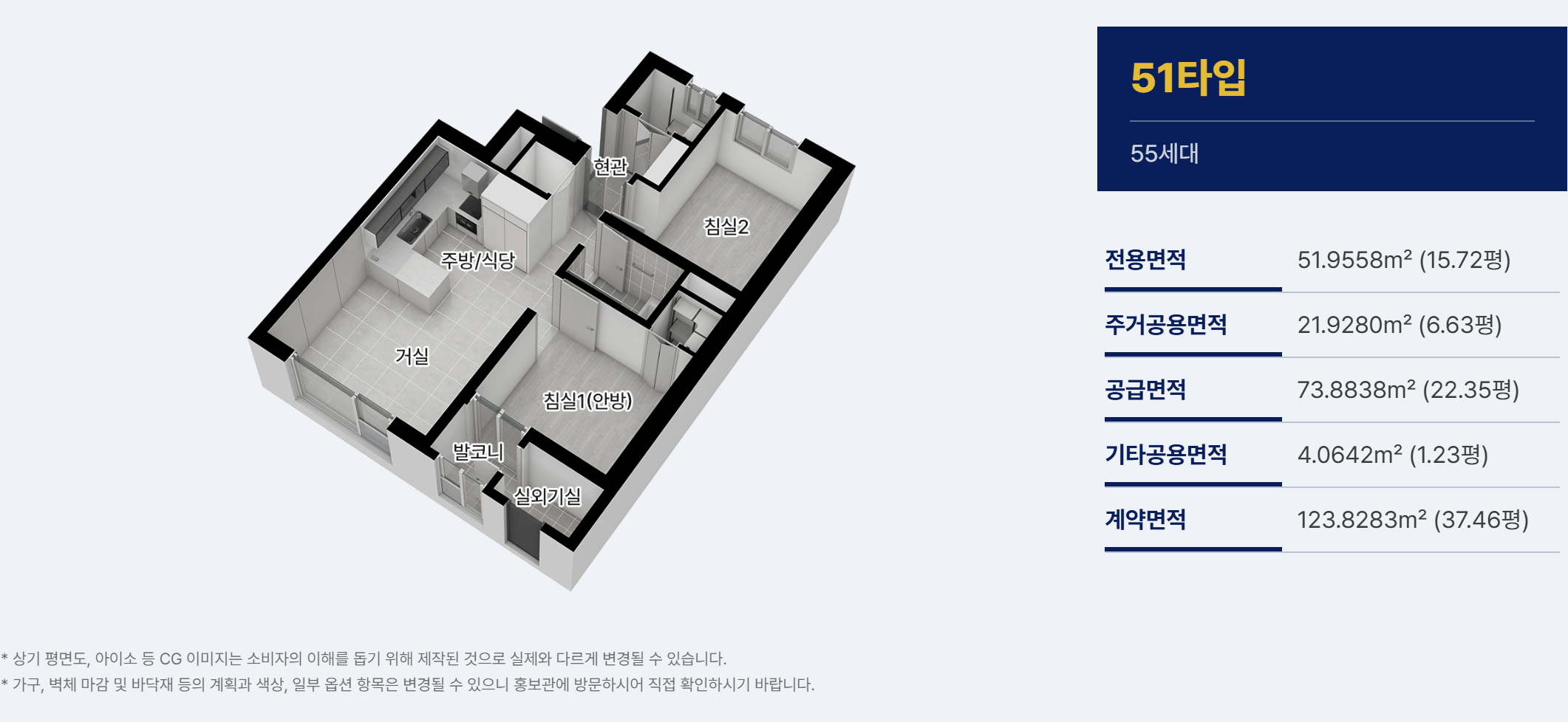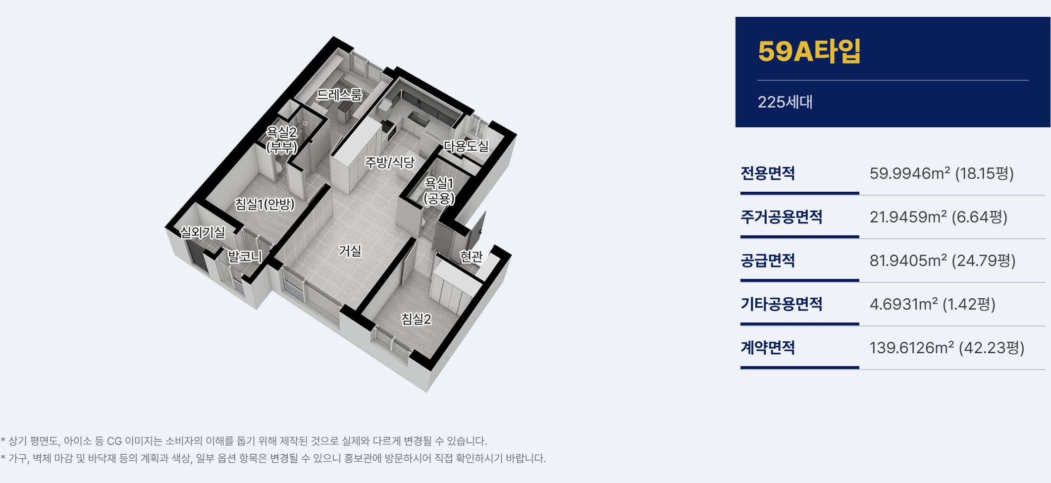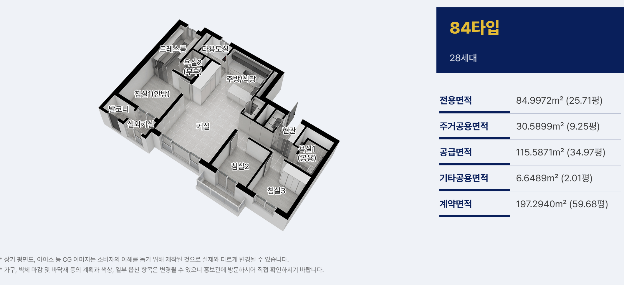라포르 미아 더퍼스트는 1인부터 4인 가구까지 자연스럽게 포괄합니다. 51제곱미터는 1, 2인에게 맞춘 효율형으로 침실을 넓게 확보하고 세탁실과 현관 팬트리까지 갖춰 작은 면적에서도 생활의 복잡도를 줄이는 구성입니다. 59제곱미터 A는 대면형 주방과 맞통풍을 강조해 공기 순환과 개방감을 동시에 잡고, 방을 독립적으로 배치해 가족 구성원이 서로의 리듬을 존중하기 좋습니다. 59제곱미터 B는 타워형으로 안방을 분리 배치하고 아일랜드를 통해 주방 활용도를 끌어올렸으며 욕실 2개와 안방 발코니가 더해져 생활 편의가 강합니다. 74제곱미터는 LDK 중심으로 공용부를 넓혀 체감 면적을 키우고, 자녀 생활존과 마스터룸을 분리해 가족형 수요에 맞춥니다. 84제곱미터는 정남향 배치 기대감과 함께 서브 주방, 팬트리, 드레스실 등 수납과 가사 동선을 정리해 3, 4인 가구의 일상을 안정적으로 받쳐줍니다. 이런 타입 구성이 한 단지 안에서 라이프사이클을 이어갈 수 있게 만드는 점이 라포르 미아 더퍼스트의 장점입니다.