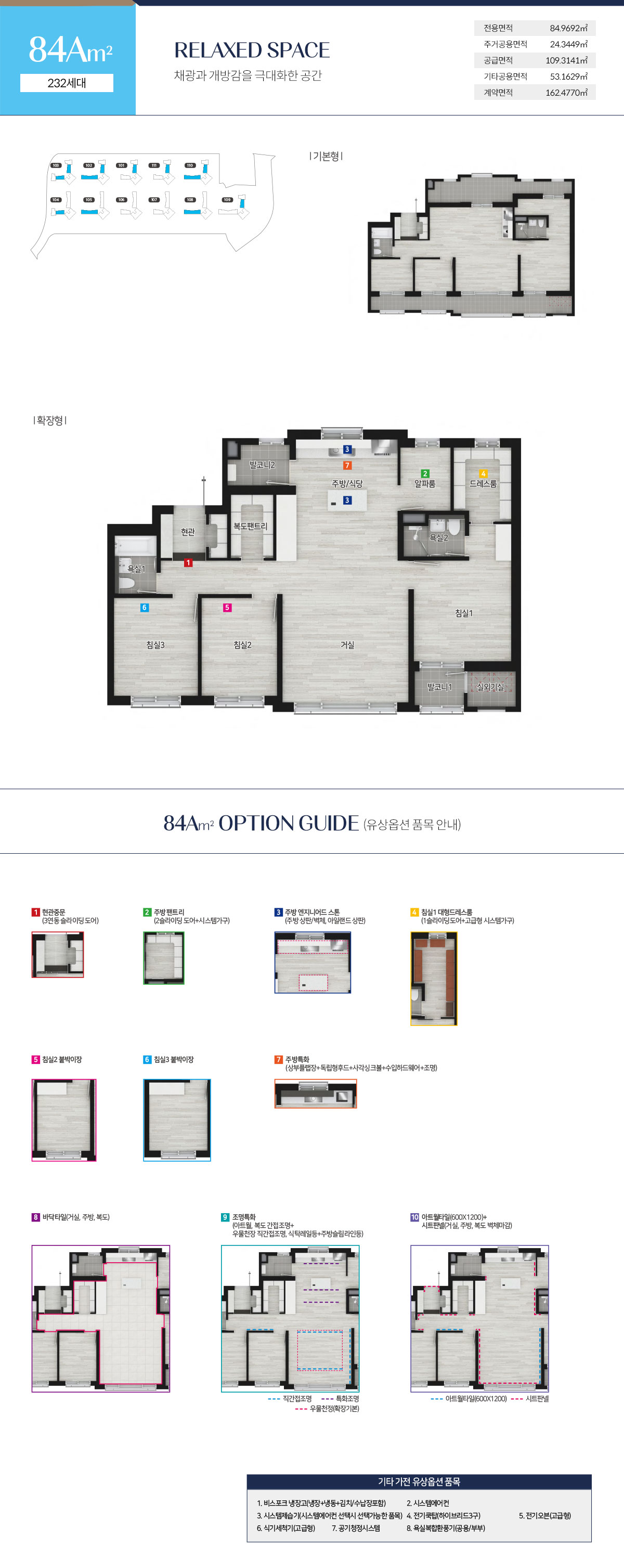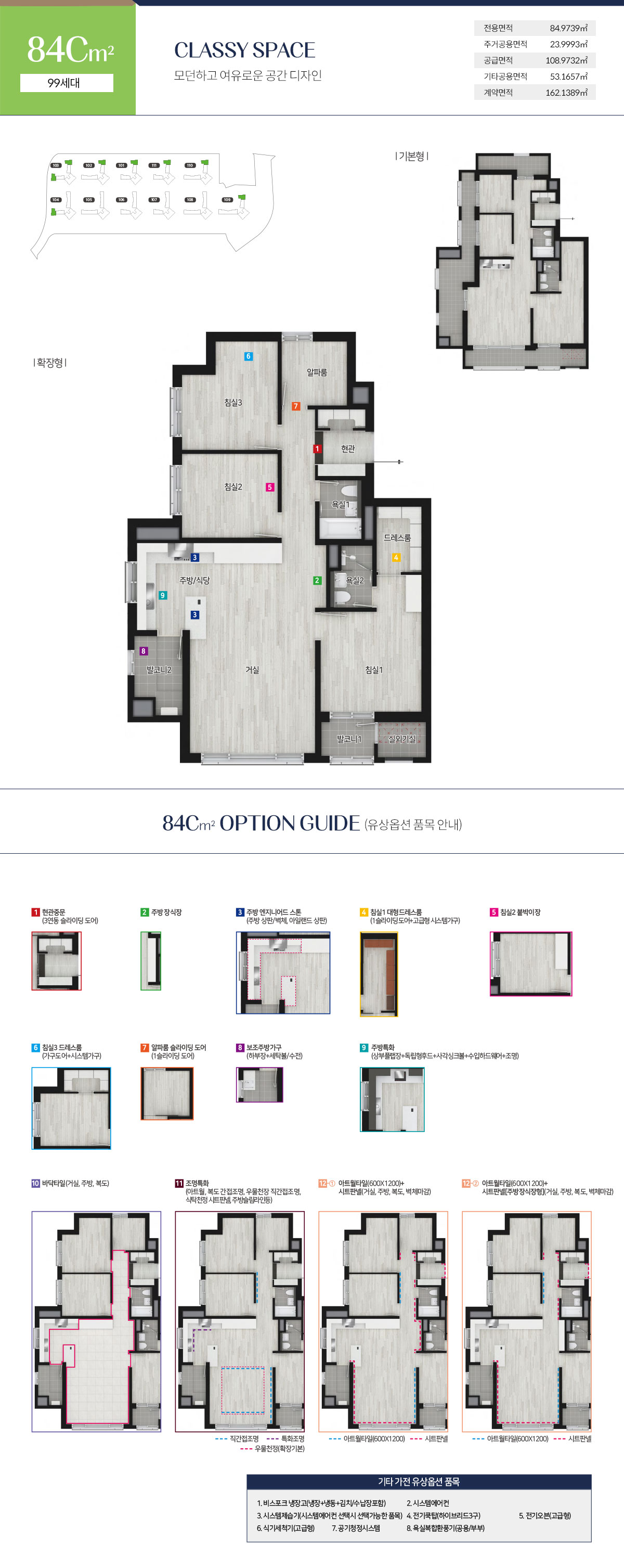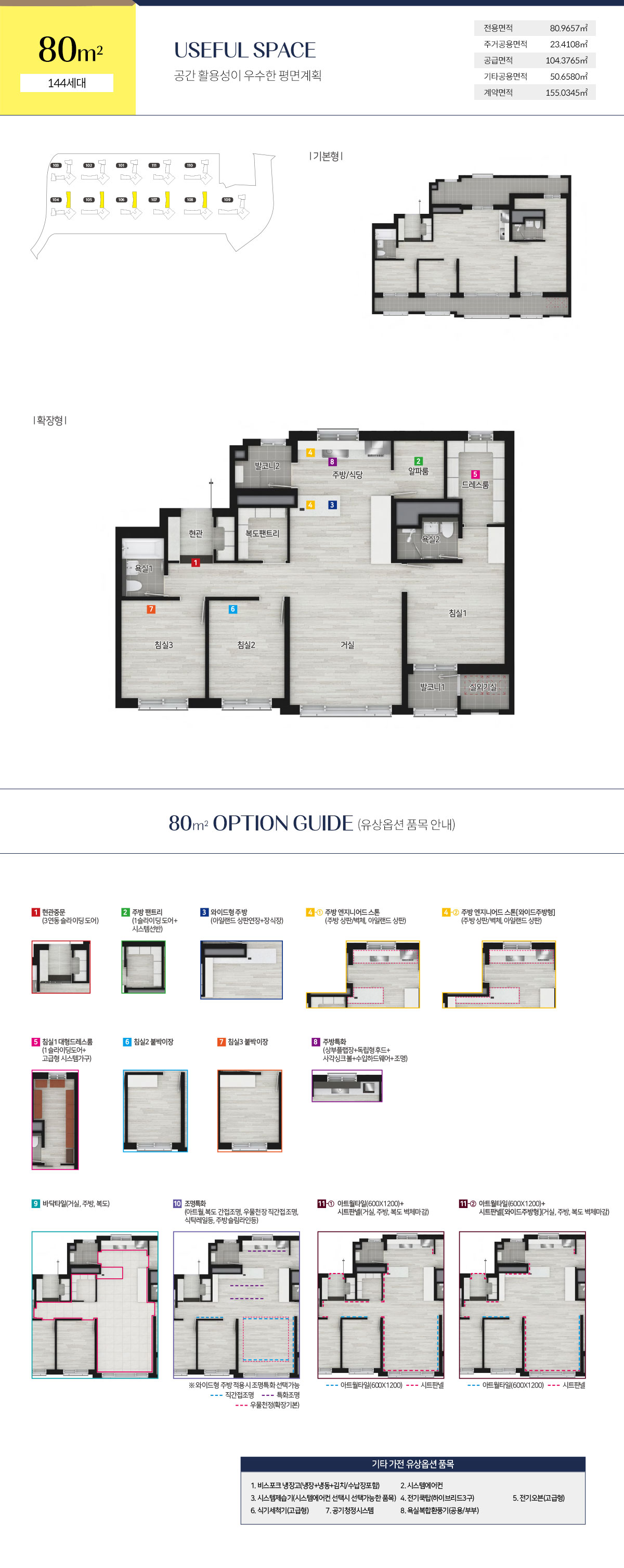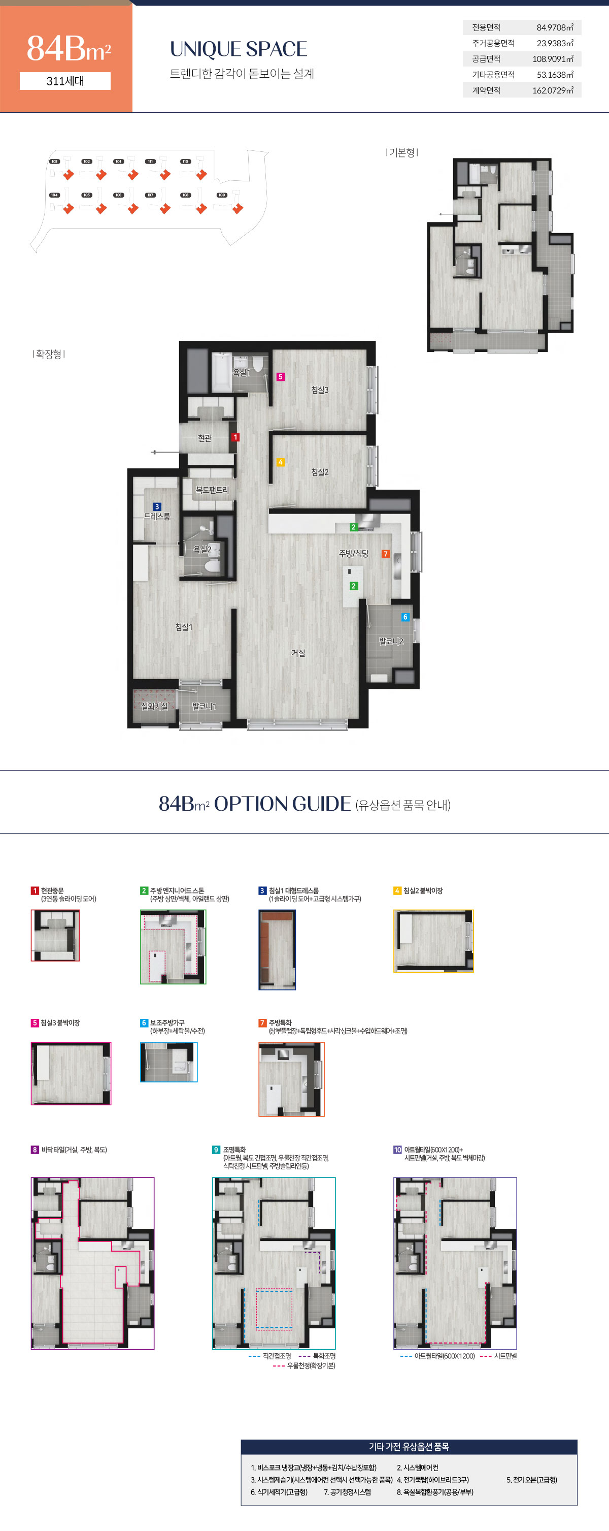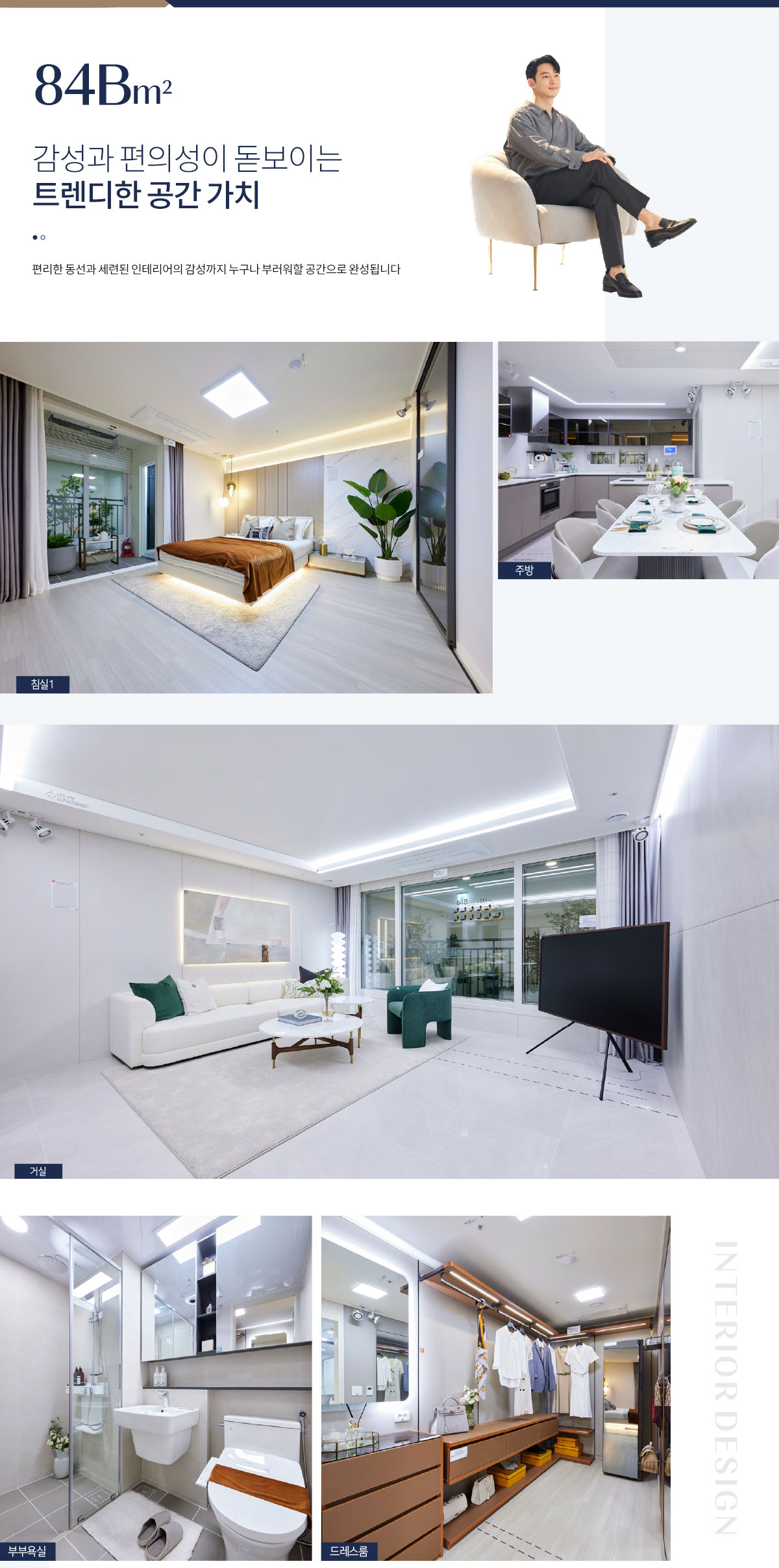전용 80㎡ 144세대, 84㎡ 642세대(3개 타입), 115㎡ 87세대로 실수요 중심 라인업입니다. 기본은 4베이 판상형으로 거실·침실이 일렬에 배치돼 일사가 균일하고, 맞통풍 설계로 환기 성능이 우수합니다. 84C는 3면 개방으로 채광·조망을 극대화했습니다. 주방-다이닝-거실이 이어지는 오픈 스페이스는 가족 커뮤니케이션이 자연스럽고, 발코니와 연계해 보조주방(유상)을 더하면 가사 동선이 한층 짧아집니다. 현관창고·팬트리·안방 드레스룸은 수납력을 키우고, 자녀방 붙박이장(유상)과 115㎡의 추가 방 구성은 성장형 라이프스타일에 대응합니다. 실사용성을 중시하는 분께 원주 동문 디 이스트의 설계는 분명한 해답입니다.