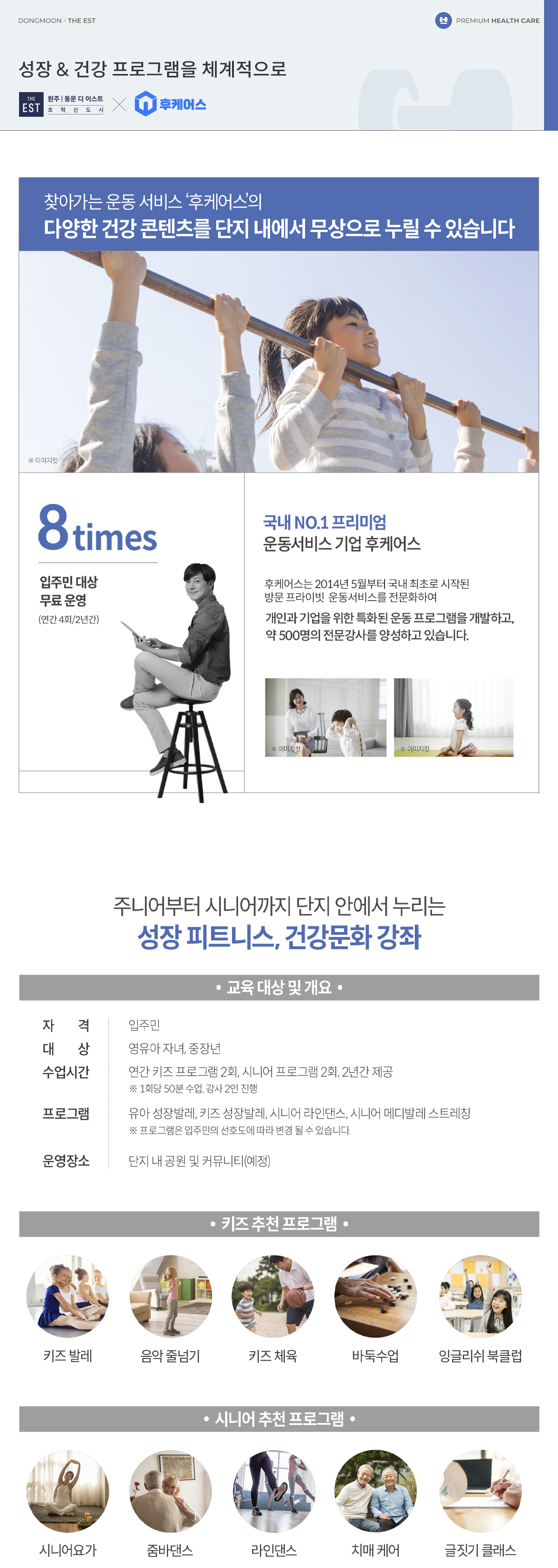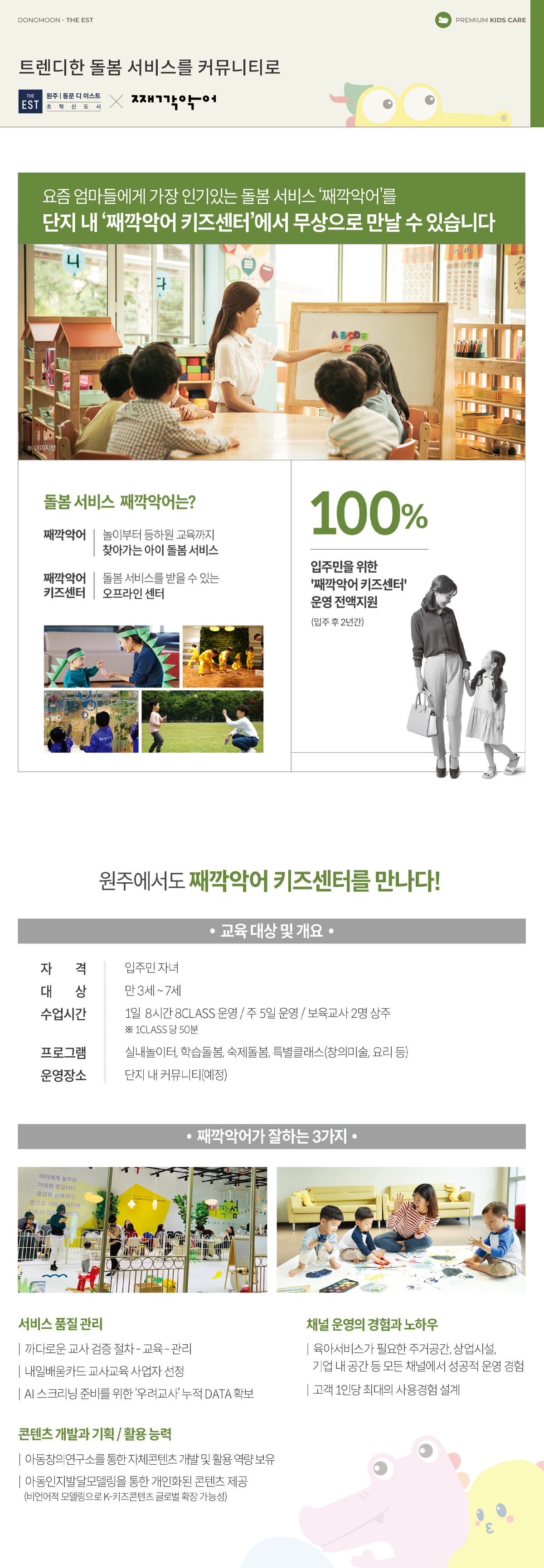 피트니스, GX룸, 실내 퍼팅·골프연습장, 작은도서관, 경로당 등 일상형 커뮤니티가 촘촘합니다. 국공립 어린이집에 더해 ‘째깍악어’ 키즈센터 도입, 오프라인 돌봄 2년 무상 제공이 예정돼 맞벌이 가정의 체감 편익이 큽니다. 단지 내 ‘대치누리교육’은 초·중 내신 중심의 체계적 커리큘럼으로, 집 가까이에서 사교육 품질을 누릴 수 있습니다. 원주 동문 디 이스트가 일·가정 양립형 단지로 주목받는 이유입니다.