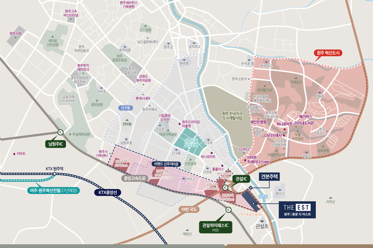 치악로를 통해 시청권·신흥 주거권을 빠르게 순환하고, 가까운 관설 하이패스IC 신설로 중앙고속도로 접근이 더 쉬워질 전망입니다. 원주역(중앙선)에서 청량리까지 약 40분, 만종·서원주역의 경강선 이용으로 광역 이동이 편리합니다. 월곶판교선 연결 시 강릉–인천 축의 철도 네트워크까지 확장됩니다. 원주 동문 디 이스트는 자차·철도 모두 선택지가 넓은 ‘멀티 모달’ 입지입니다.
