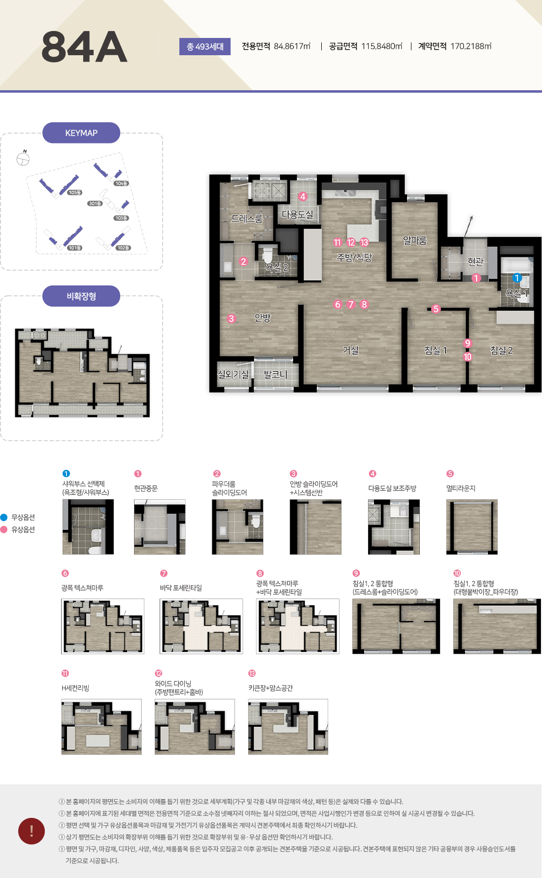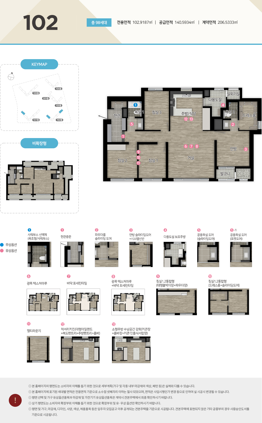 주력형 84A는 4베이 판상형과 맞통풍 동선이 장점입니다. 거실-주방 일직선 동선으로 생활 효율을 높이고, 알파룸·팬트리·현관창고·드레스룸을 곳곳에 배치해 수납 스트레스를 줄였습니다. 84B는 타워형 배치로 실·공간 분리가 확실해 사생활 보호에 유리합니다. 102㎡는 가족 수가 많은 집에 맞춘 대형 수납과 여유 있는 침실 폭이 강점입니다. 힐스테이트 서대구역 센트럴의 전 타입에 강화유리 난간, 와이드 창호를 적용해 개방감과 조망을 극대화한 점도 눈에 띕니다.