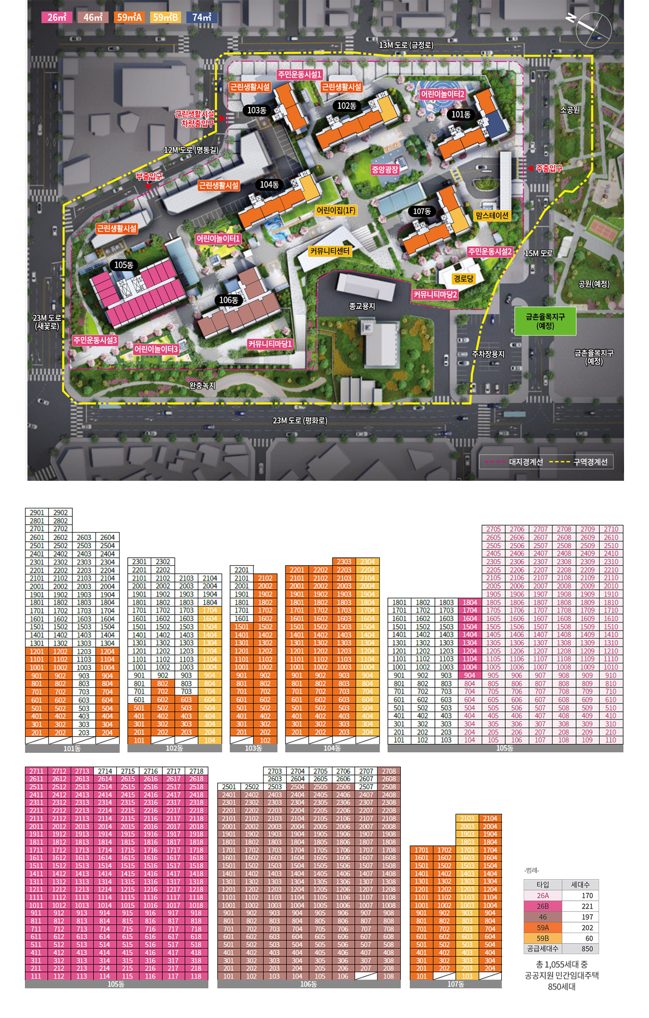 지하 3층~지상 29층, 7개 동, 총 1,055가구 규모로 이 중 약 850가구가 공공지원민간임대로 공급됩니다. 선호도 높은 26~59㎡ 소형 위주 라인업은 1~2인 가구, 신혼, 맞벌이 가정의 실사용성에 맞춰 설계되었습니다. 파주금촌 금호어울림은 남향 위주 배치와 넓은 동간 거리로 채광·프라이버시를 확보하고, 전 세대 지상차 없는 단지 계획으로 보행 안전성을 높였습니다.