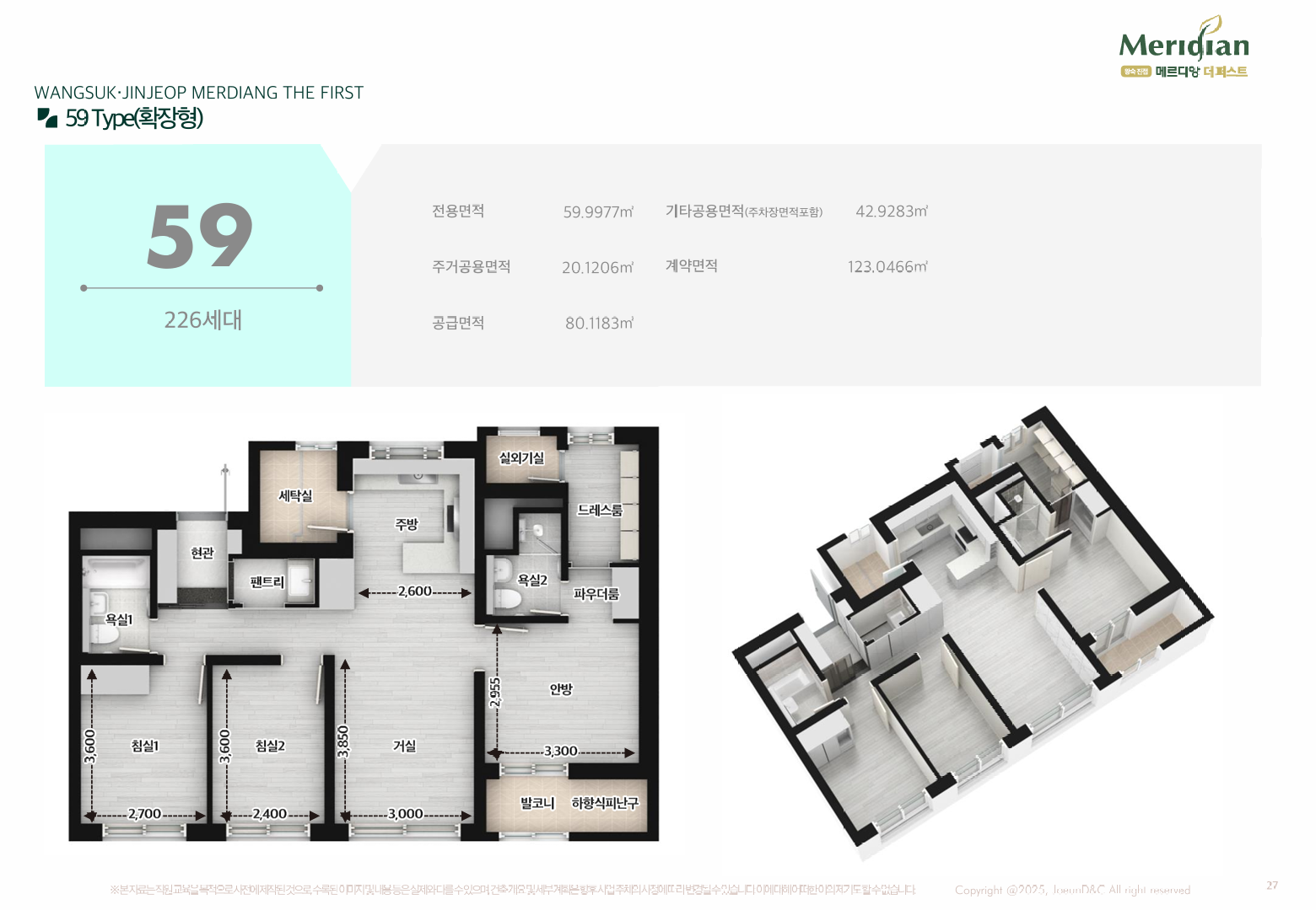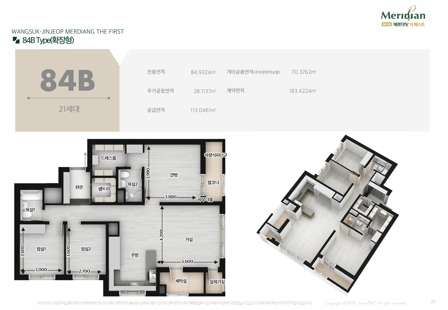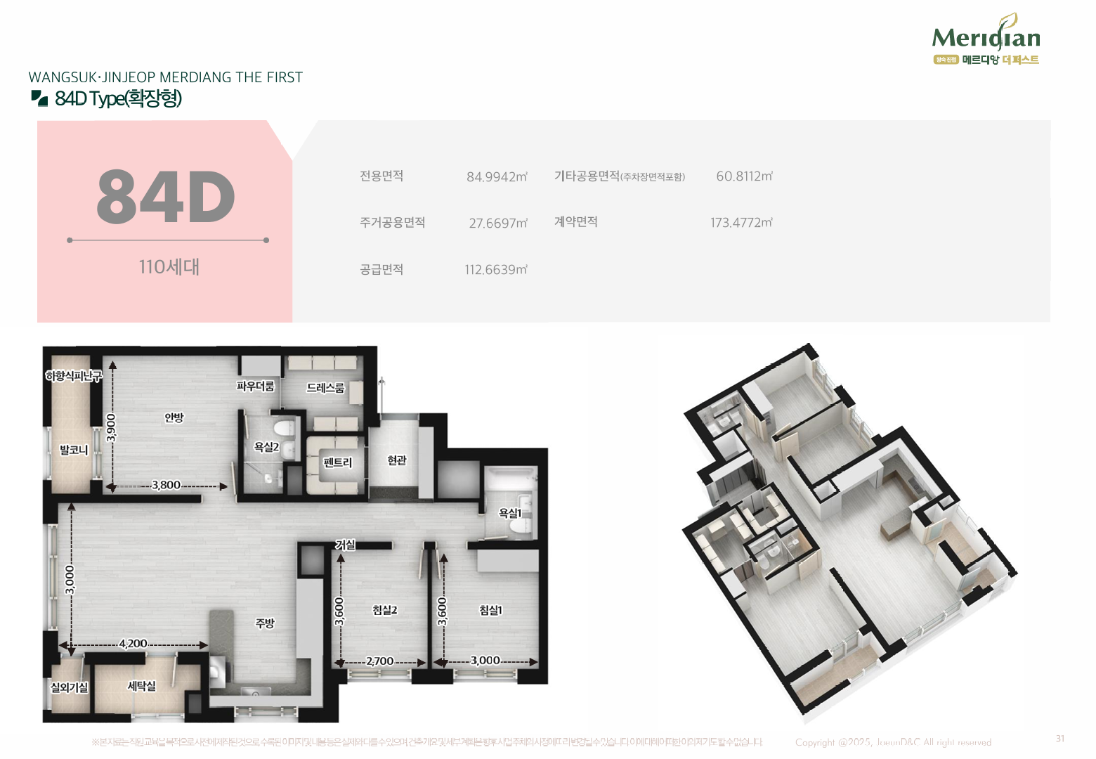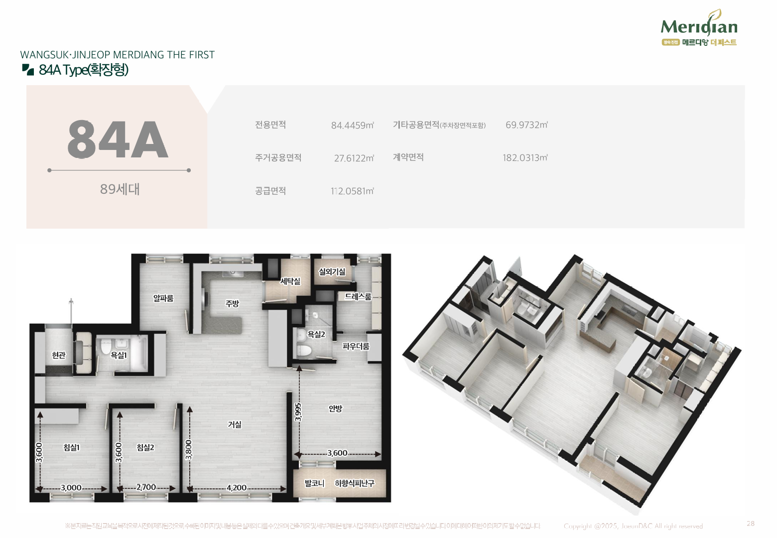 주력 타입은 전용 59·84㎡입니다. 84㎡는 판상형 4Bay 비중이 높아 맞통풍과 채광이 탁월하고, 알파룸·드레스룸·팬트리 등 수납을 곳곳에 숨겨 실사용 면적을 극대화했습니다. 일부 세대에는 테라스형 평면을 도입해 희소성을 더했고, 세탁실–주방–팬트리로 이어지는 ‘가사 동선’이 효율적이어서 바쁜 평일에도 집안일 동선이 짧습니다. 실내는 가변벽을 통해 거주 형태 변화(신혼→유아기→학령기)에 맞춘 재배치가 쉬워, 장기 거주를 염두에 둔 분들께 왕숙 진접 메르디앙 더퍼스트의 장점이 분명합니다.