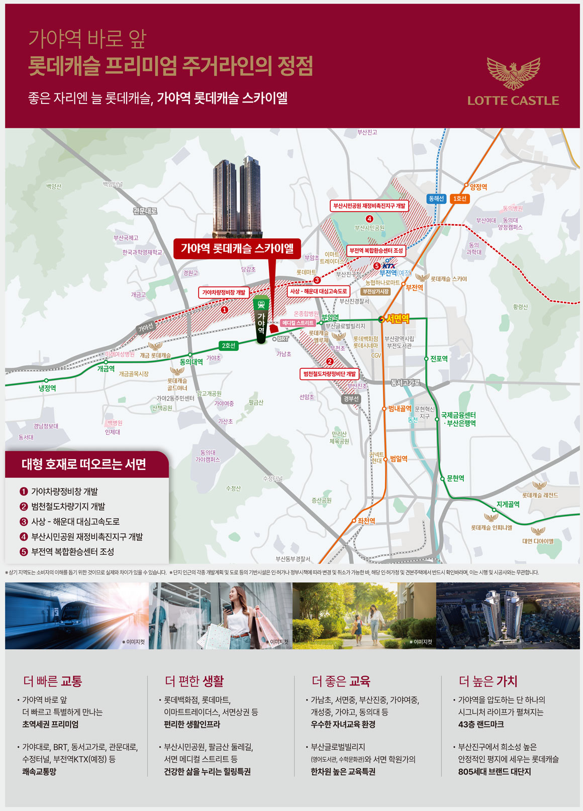 부산의 도심 재생 어젠다는 북항 재개발, 범천 차량기지 이전부지의 혁신 파크화, 문현금융단지 확장 같은 방향으로 수렴합니다. 해양·물류·업무 기능이 부산 도심 전역으로 확장되면 상업·업무 일자리의 공간적 분산이 가속화되고, 도심 내 초역세권 신축의 체류 가치는 자연스럽게 올라갑니다. 여기에 고층 오피스·호텔·리테일이 추가 공급되면 서면과 북항을 잇는 축의 유동 인구가 늘고, 주거와 상업의 상호 보완 관계가 뚜렷해집니다. 이 변화의 수혜권 안에 있는 가야역 롯데캐슬 스카이엘은 생활 편익과 상권 접근성 면에서 구조적 우위를 점할 가능성이 큽니다.