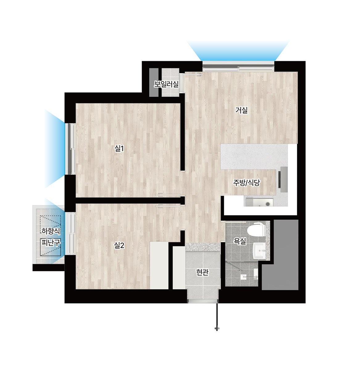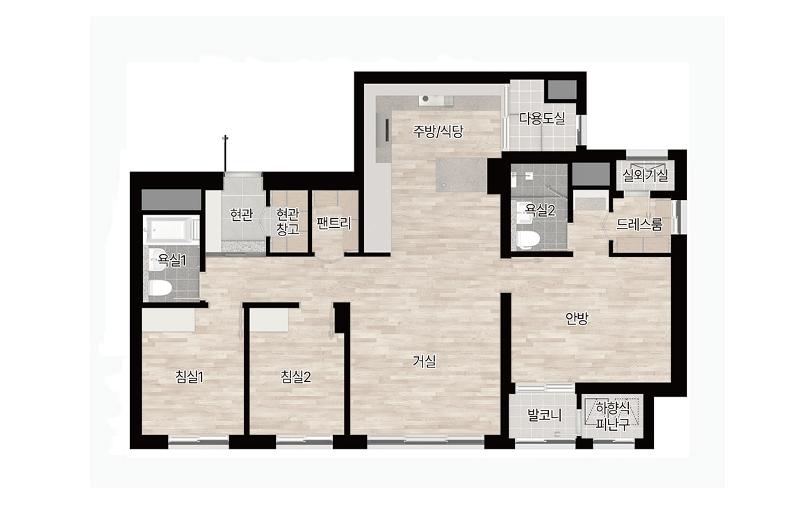 주력 면적은 59, 77, 84제곱미터로, 실수요가 두터운 중소형 구간을 집중 공략했습니다. 84형은 4베이 판상형 중심의 평면을 통해 거실 전면 폭과 채광을 확보했고, 대면형 주방과 다용도실 직결 가사 동선으로 체류 시간을 효율화했습니다. 현관 창고, 팬트리, 드레스룸을 적재적소에 배치해 수납 압력을 낮췄고, 일부 타입은 가변 벽체를 적용해 생애주기 변화에 따른 공간 전환이 수월합니다. 59형은 발코니 확장 시 체감 거실 폭이 커져 30평대 구축을 대체하려는 수요에도 대응합니다. 마감과 설비는 거실·주방의 개방감을 살리는 창호 비례, 건식과 습식의 명확한 욕실 분리, 무인 택배와 원패스 출입 등 생활 디테일에 힘을 준 구성이 눈에 띕니다.
