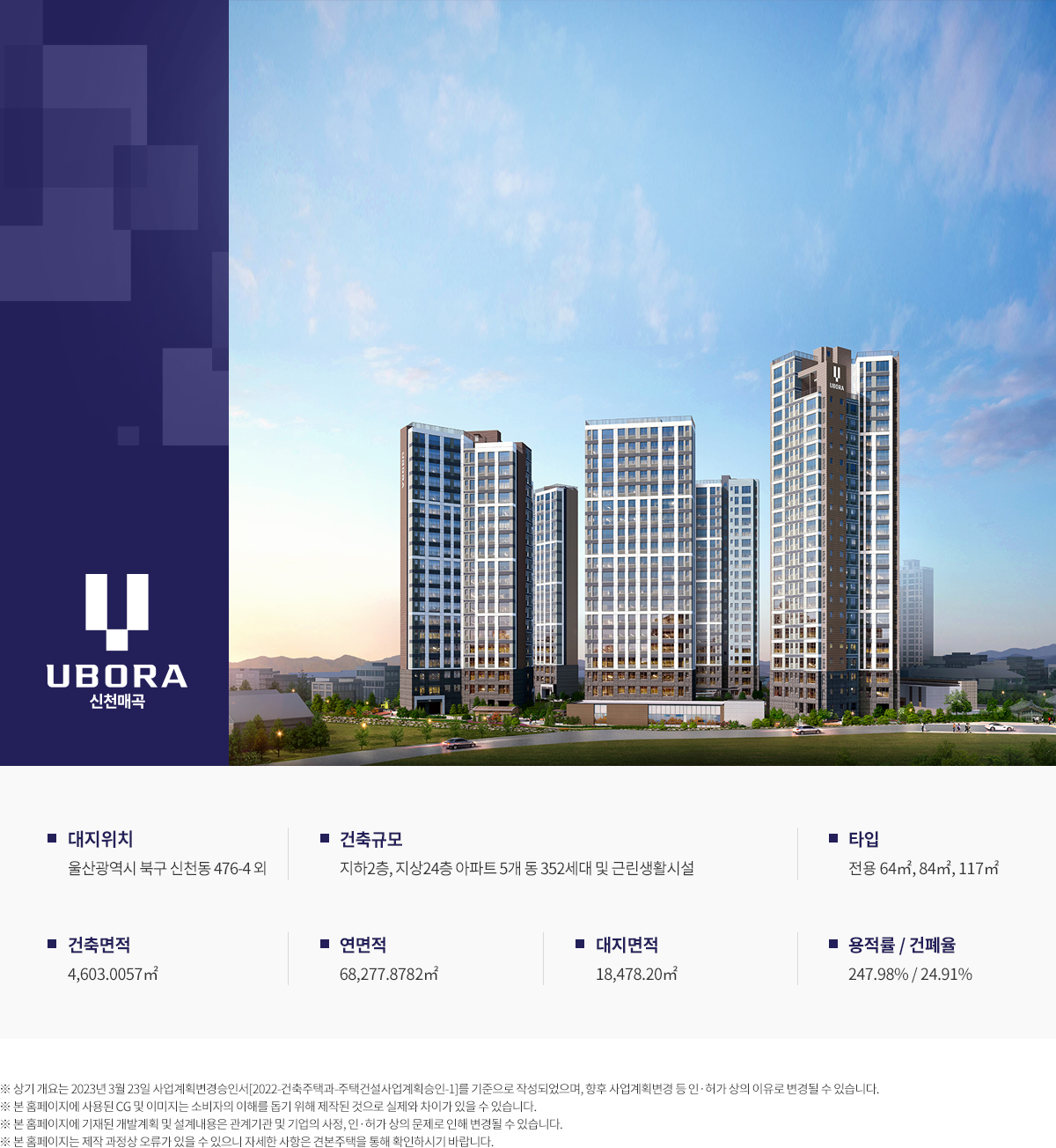 신천매곡 반도유보라는 울산광역시 북구 찬샘길 일원에 들어서는 5개 동, 지하 이층부터 지상 이십사층의 대단지입니다. 공동주택은 총 삼백오십이 세대이며, 주차는 오백칠십오 면으로 가구당 약 한 점 육 대 수준을 확보해 출퇴근 피크 시간에도 동선이 여유롭습니다. 대지 규모와 연면적의 균형, 적정한 건폐율과 용적률 설계는 일상의 채광·통풍·조망을 염두에 둔 기본기에서 출발합니다. 이 기본기가 신천매곡 반도유보라의 장기 거주 가치를 받쳐 줍니다.
