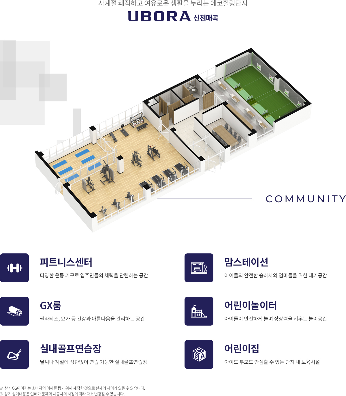 지상은 차량을 비우고 공원형으로 계획해 보행 안전을 최우선에 두었습니다. 중앙에는 다목적 운동 공간과 잔디 마당, 놀이터가 이어져 아이와 어른의 하루가 자연스럽게 만납니다. 남향 위주 배치와 넉넉한 동간 이격은 채광과 프라이버시를 동시에 지켜 주고, 완충 녹지가 외부 간섭을 줄여 조용한 일상을 만듭니다. 실내 커뮤니티에는 피트니스, GX룸, 실내 골프연습장, 어린이집이 자리하고, 주 출입구 맘스스테이션을 통해 초등 저학년의 통학 동선까지 세심하게 챙겼습니다. 신천매곡 반도유보라는 단지 안팎에서 머무르는 시간이 편안하도록 생활의 접점을 촘촘히 쌓았습니다.